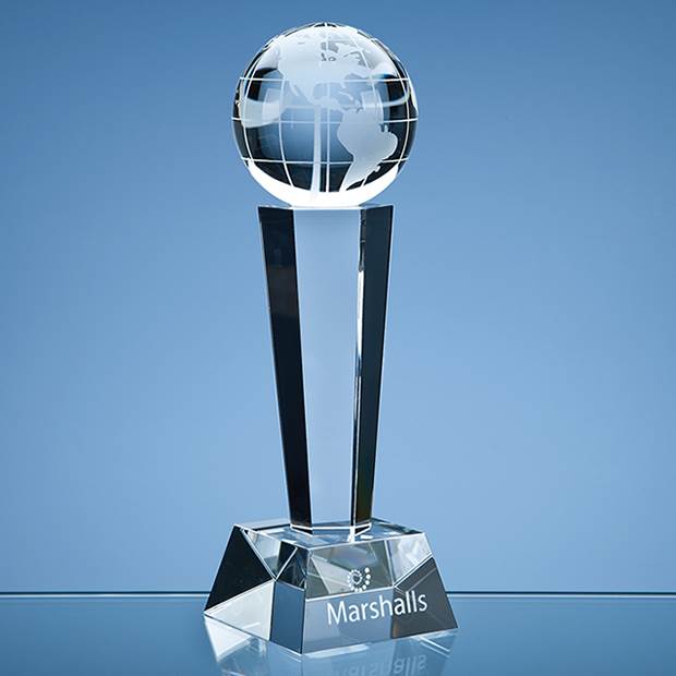 The 8cm Globe is mounted onto a 6 sided optical crystal facetted column and base to create an award that is an ideal recognition, achievement or incentive gift for global, travel or transport based companies. It can be personalised on the base with any crest, logo or wording to create an award that is sure to take pride of place when put on display at home or at work. It is supplied in a black foam lined presentation box.