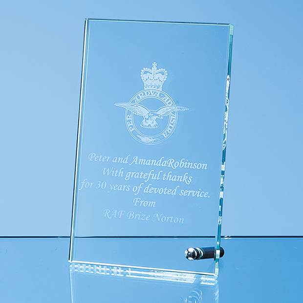 The stylish and versatile jade glass rectangle can be displayed vertically or horizontally with the aid of a chrome pin stand. There is a large area that can be printed or engraved with any crest, logo or wording to create an inexpensive recognition award or gift. The rectangle is available in 4 other sizes.