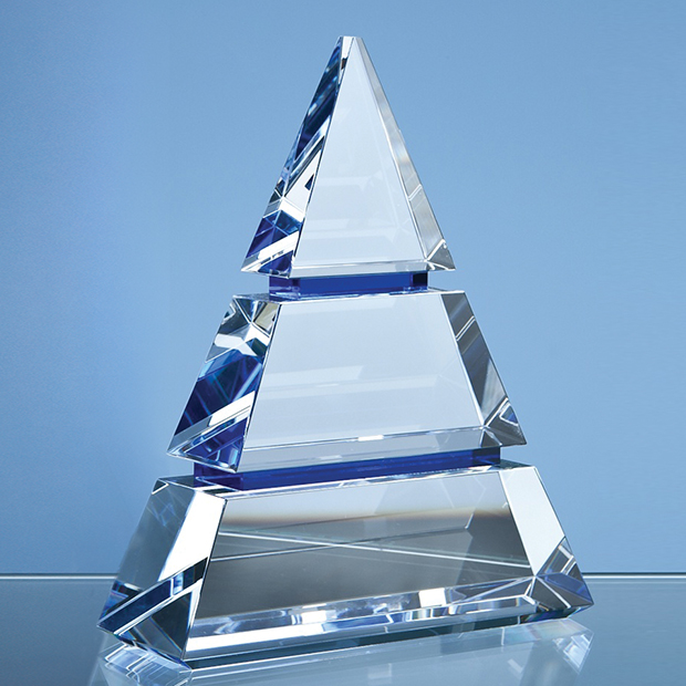 The exquisite 15cm Luxor Award is hand crafted out of perfectly clear optical crystal and Sapphire Blue crystal to create this unique pyramid shaped award. It can be personalised with any crest, logo or wording to create an award that is sure to take pride of place when put on display at home or at work. The award is an ideal recognition, achievement or incentive gift and it is supplied in a black foam lined presentation box.