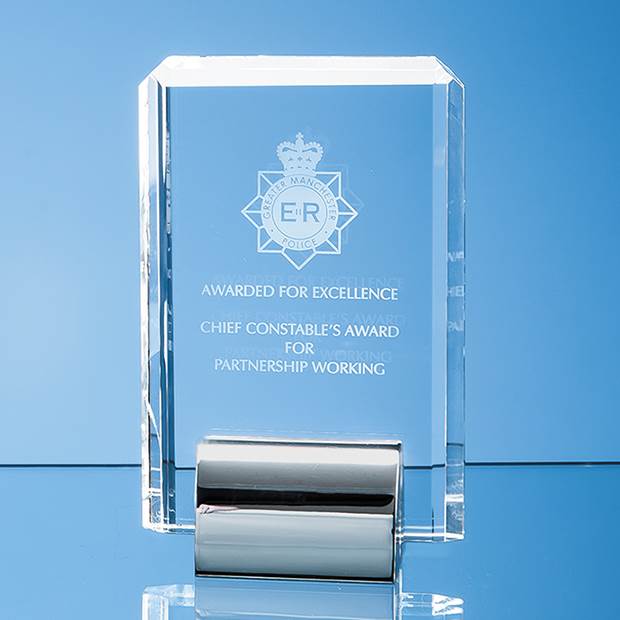 Stylish and ultra modern in appearance, the perfectly clear 15cm Optical Crystal Rectangle is mounted on a chrome plated base to create an exquisite recognition, achievement or incentive gift. It can be personalised with any crest, logo or wording to create an award that is sure to take pride of place when put on display at home or at work. It is supplied in a black foam lined presentation box.