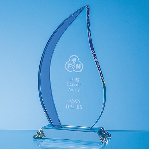 The 20cm Optical Crystal Clear & Cobalt Blue Flame Award captures the essence of success and embodies accomplishment. There is a generous engraving area that can be personalised with any crest, logo or wording to create an award that is sure to be treasured by the recipient. The award is supplied in a foam lined gift box.