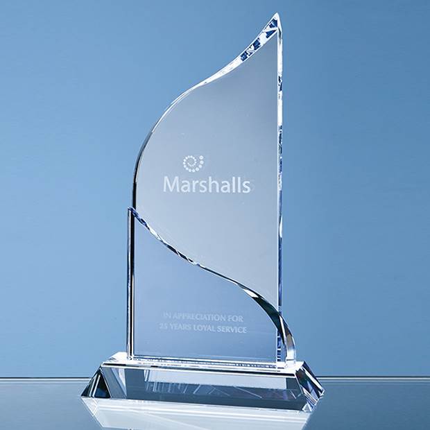 The Grand Bleu awards perfectly combine a sweeping curve of clear optical crystal with a wave shaped front section of Marine Blue crystal. They are mounted onto a facet edged rectangular base to create an exquisite recognition, achievement or incentive gift. They can be personalised with any crest, logo or wording to create an award that is sure to take pride of place when put on display at home or at work. They are available in 3 sizes and are supplied in a black foam lined presentation box.
