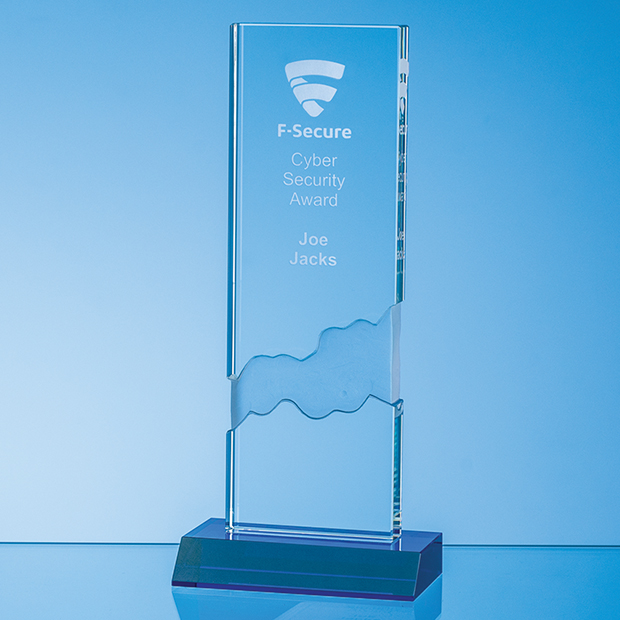 The 23cm Optical Crystal Deep Etched Mounted Rectangle on a Cobalt Blue Base commands attention with its stylish appearance featuring a frosted design on the reverse side of the upper part of the award. Meticulously hand crafted from the finest quality optical crystal the award captures the essence of success and embodies accomplishment. There is a generous engraving area that can be personalised with any crest, logo or wording to create an award that is sure to be treasured by the recipient. The award is supplied in a foam lined gift box.