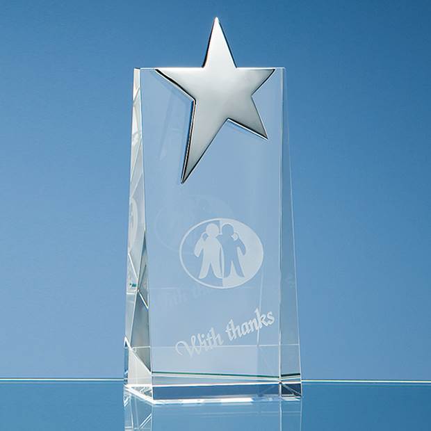 A fantastic range of modern looking awards that perfectly combine a hand crafted optical crystal rectangle with a silver plated star to make an award well worth winning. The rectangles are available in 3 sizes and can be personalised with any crest, logo or wording to create an award that is sure to take pride of place when put on display at home or at work. They are ideal recognition, achievement or incentive gifts and are supplied in a black foam lined presentation box.