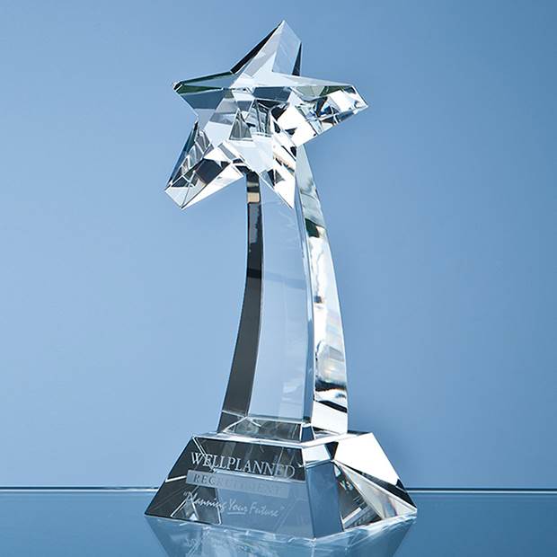 The elegant and very stylish Shooting Star award is hand crafted out of perfectly clear optical crystal. It makes an ideal recognition, achievement or incentive gift for people who shine within your organisation. It can be personalised with any crest, logo or wording to create an award that is sure to take pride of place when put on display at home or at work. It is supplied in a black foam lined presentation box.