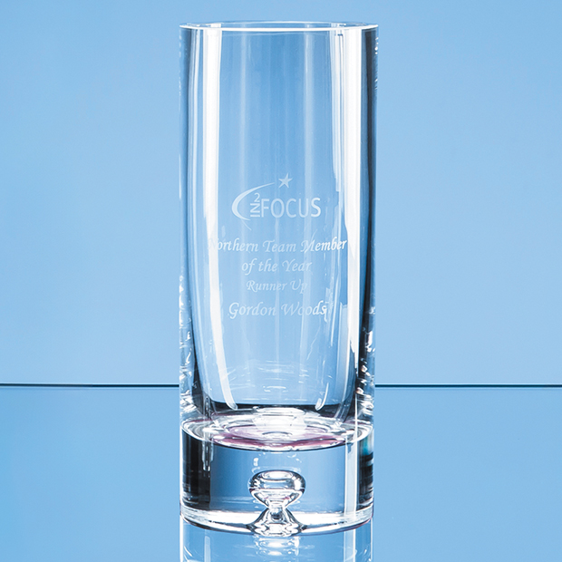 The handmade bubble base cylinder vase is elegant in its design. There is a large area that can be personalised with any crest, logo or wording to create a gift that is ideal for a special occasion and it would look great on display at home or in the office.