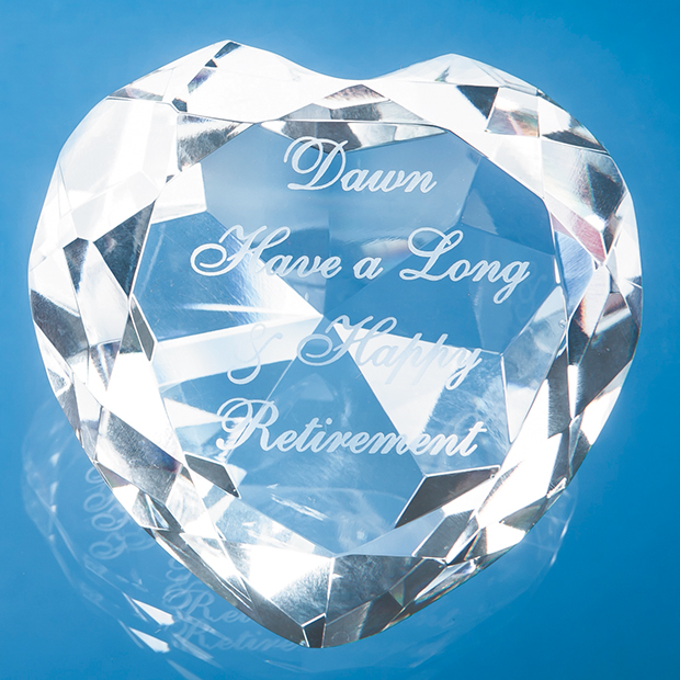 The optical crystal clear facet heart paperweight is an ideal keepsake gift to suit any occasion. It can be personalised with any wording, logo or crest and will be displayed with pride at home or in the office.