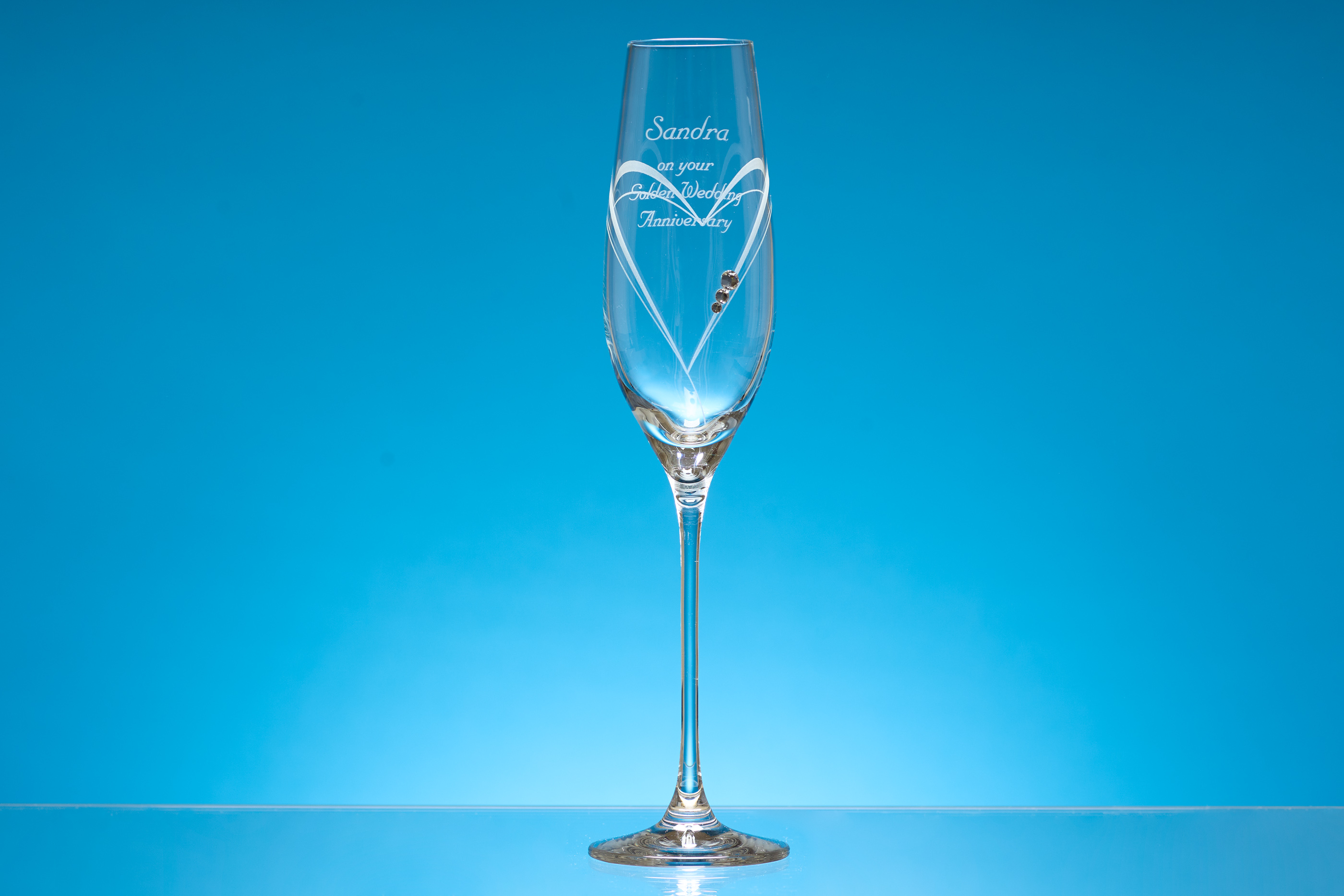 The single champagne flute is decorated with heart shaped cutting and has 3 Swarovski crystals bonded to the glass. The flute has an engraving area where it can be personalised with any crest, logo or wording. It would look great as part of the table wear at any special occasions or presented as a wedding or engagement gift.