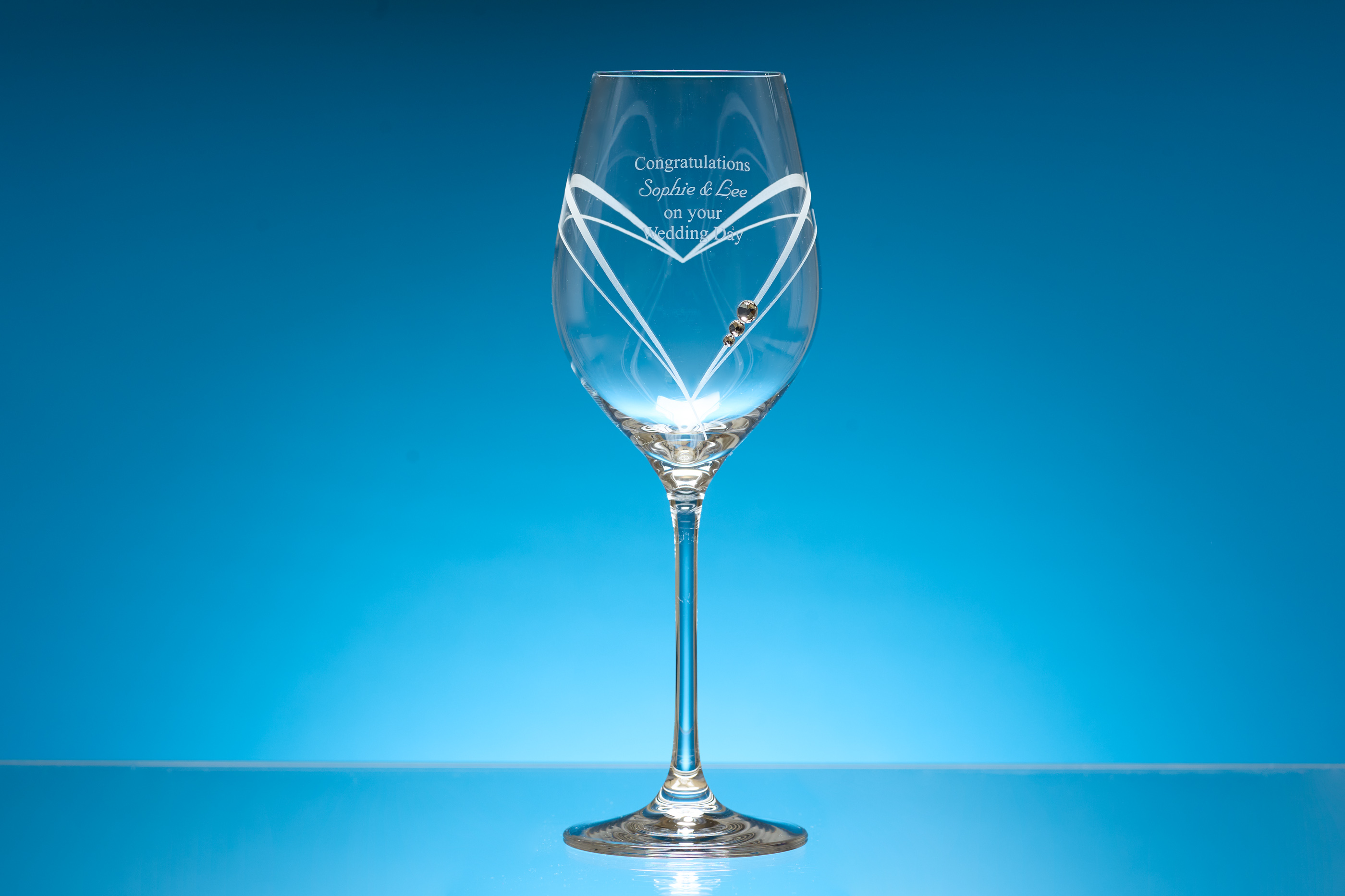 The single wine glass is decorated with heart shaped cutting and has 3 Swarovski crystals bonded to the glass. The glass has an engraving area where it can be personalised with any crest, logo or wording. It would look great as part of the table wear at any special occasions or presented as a wedding or engagement gift.