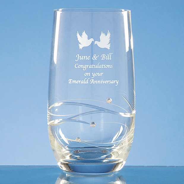 This single High Ball is a delicate tapered design with spiral cutting and three Swarovski crystals bonded on to the glass. There is an area for engraving and the glass can be personalised with any wording logo or crest making this a great celebratory gift.