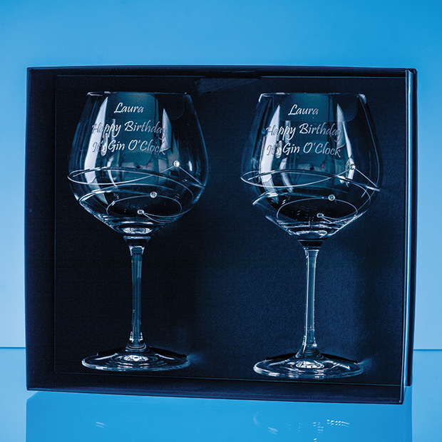 Why have one gin when you can two This pair of glasses will add a little sparkle to your drink with their diamante crystals and spiral design. They can be engraved with any wording crest or logo making them a great choice for either personalised or corporate gifts especially when they are presented in their satin lined gift box.